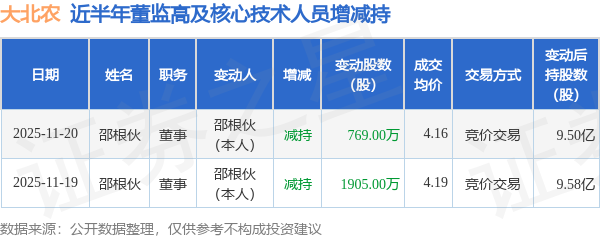 证券之星消息,根据11月21日市场公开信息、上市公司公告及交易所披露数据整理,大北农(002385)最新董监高及相关人员股份变动情况:2025年11月20日公司董事邵根伙共减持公司股份769.0万股,占公司总股本为0.1788%。变动期间公司股价下跌1.19%,11月20日当日收盘报4.15元。