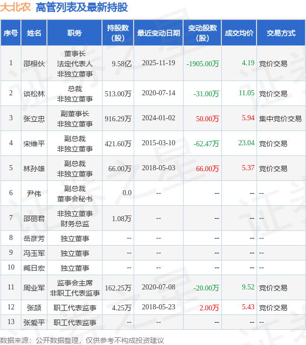 大北农近半年内的董监高及核心技术人员增减持详情如下: