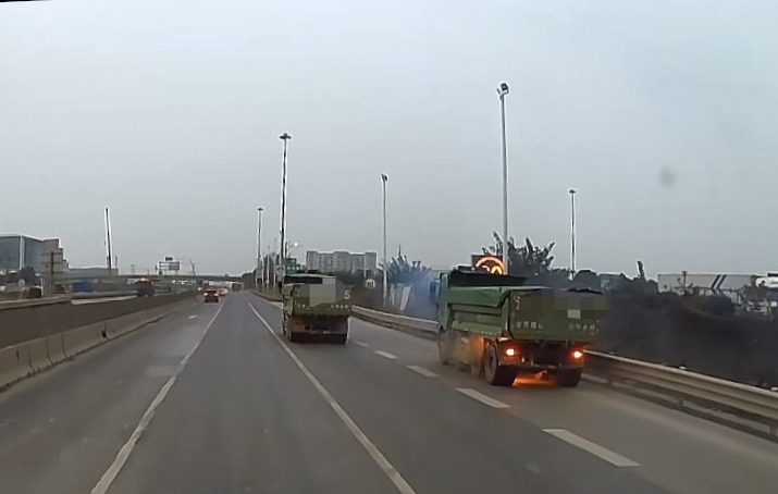 该土方车后面车辆的行车记录仪画面显示,当时多辆土方车沿事发路段行驶,其中行驶在中间车道的土方车底盘下方,突然有火光冒出,并持续有烟雾飘出。